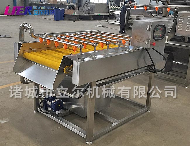 設備是由多根毛輥按照一條直線排列的,當毛輥在電機的同步帶動下沿著出料口方向做自轉(zhuǎn)運動,利用毛輥上毛刷的摩擦力與本身的向心力作用下,物料沿著入料口位置向出料口位置運動;運動過程中毛刷與物料表面接觸,去除了物料表面纏繞的毛發(fā)及其他雜質(zhì),在循環(huán)水泵的作用下,水沿著噴淋管道進入噴頭,對物料本身進行沖洗,用介質(zhì)水沖洗物料可減輕物料與毛刷之間的摩擦,防止破損,同時把物料清洗的雜質(zhì)及時的沖離。